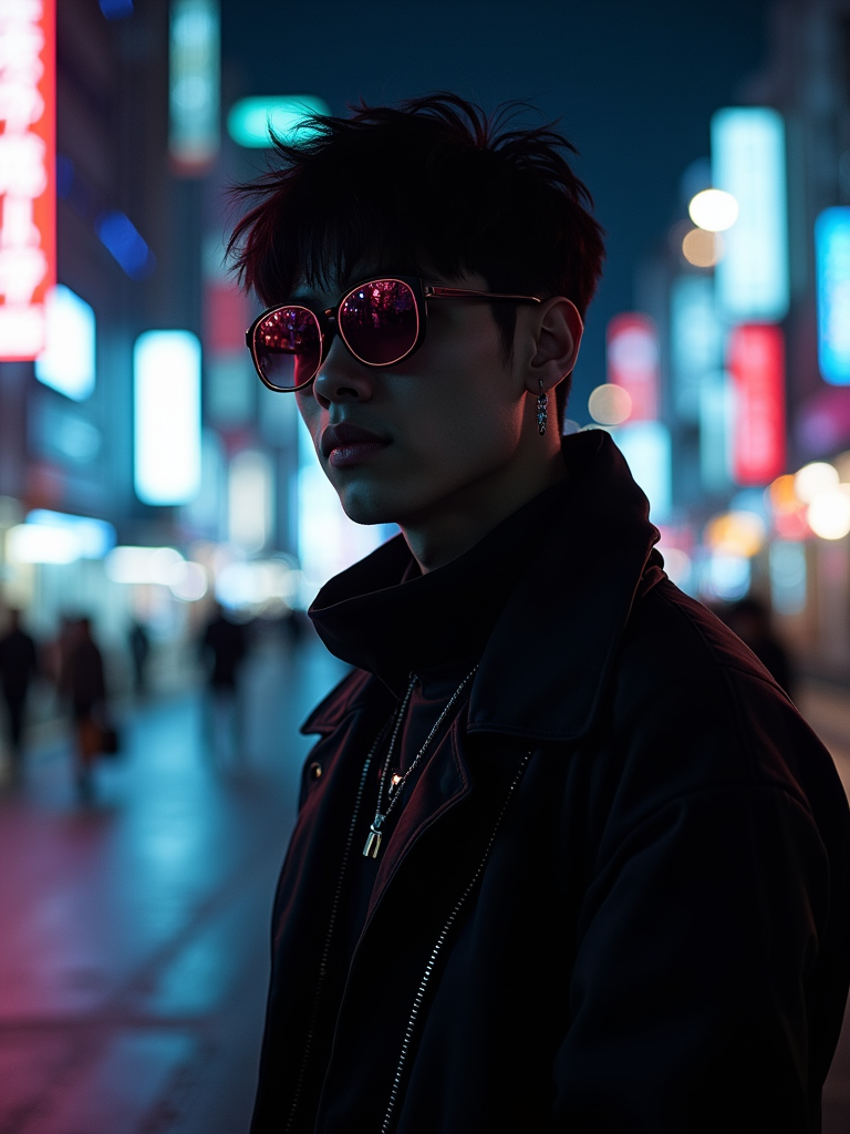 Model standing in neon-lit Tokyo at night, cyberpunk cityscape in the background. Wearing cyberpunk sunglasses, dark streetwear. Dramatic lighting, moody reflections.