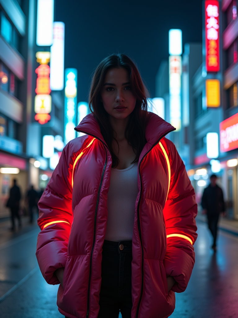 Model standing in neon-lit Tokyo at night, cyberpunk cityscape in the background. Wearing a futuristic jacket, glowing neon accessories . Dramatic lighting, moody reflections.
