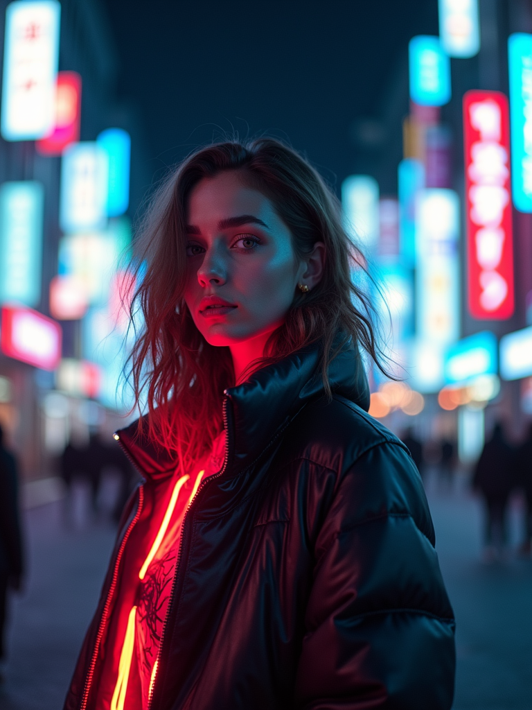 Model standing in neon-lit Tokyo at night, cyberpunk cityscape in the background. Wearing a futuristic jacket, glowing neon accessories . Dramatic lighting, moody reflections.