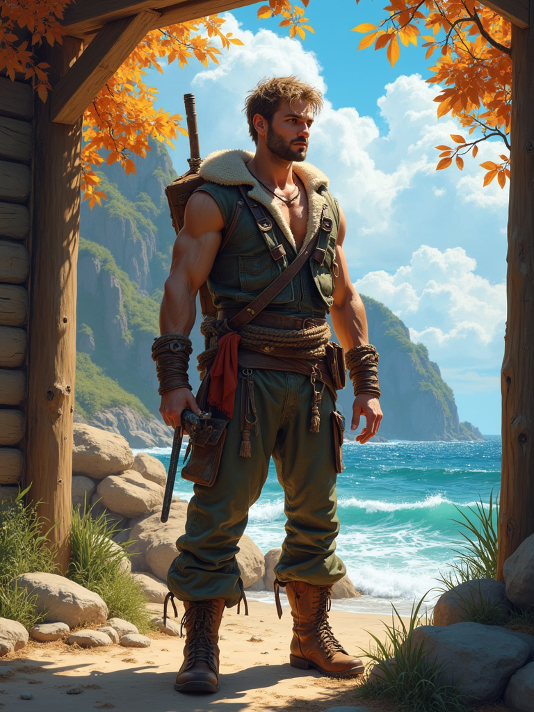 Model standing outside a wooden village by the sea. Wearing leather vest and rugged boots, carrying tools. Coastal RPG setting, colorful trees, painterly sunlight.