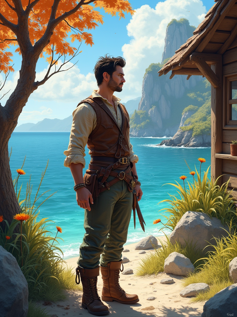 Model standing outside a wooden village by the sea. Wearing leather vest and rugged boots, carrying tools. Coastal RPG setting, colorful trees, painterly sunlight.