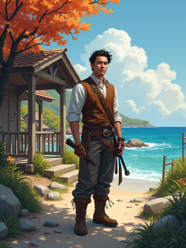 Model standing outside a wooden village by the sea. Wearing leather vest and rugged boots, carrying tools. Coastal RPG setting, colorful trees, painterly sunlight.