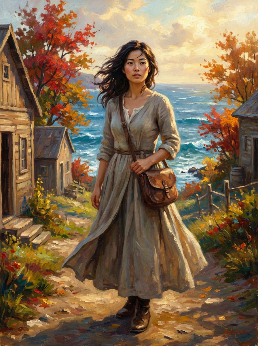 Model standing outside a wooden village by the sea. Wearing linen travel dress, satchel, windswept hair . Coastal RPG setting, colorful trees, painterly sunlight.