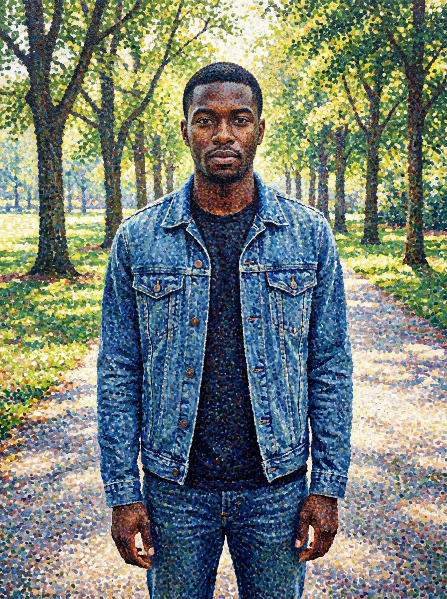 Model transformed into a pointillist painting. Detailed dots, artistic pattern. Seurat-inspired style.