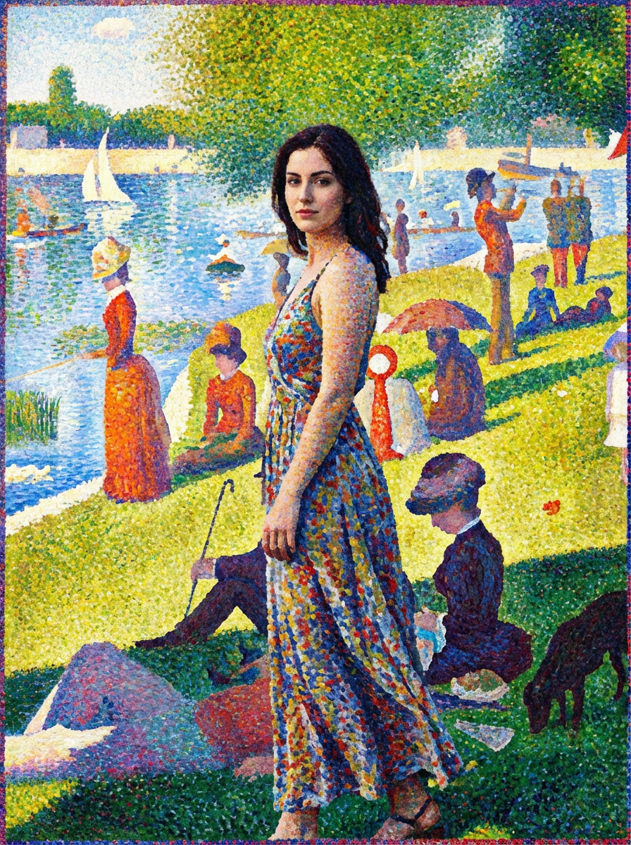 Model transformed into a pointillist painting. Dotted texture, vibrant colors . Seurat-inspired style.