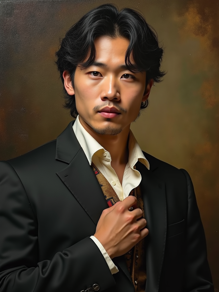 Model transformed into an oil painting portrait. Classic pose, formal attire. Renaissance style, rich textures, artistic brushstrokes.