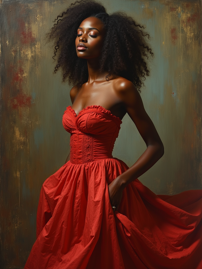 Model transformed into an oil painting portrait. Elegant pose, flowing dress . Renaissance style, rich textures, artistic brushstrokes.