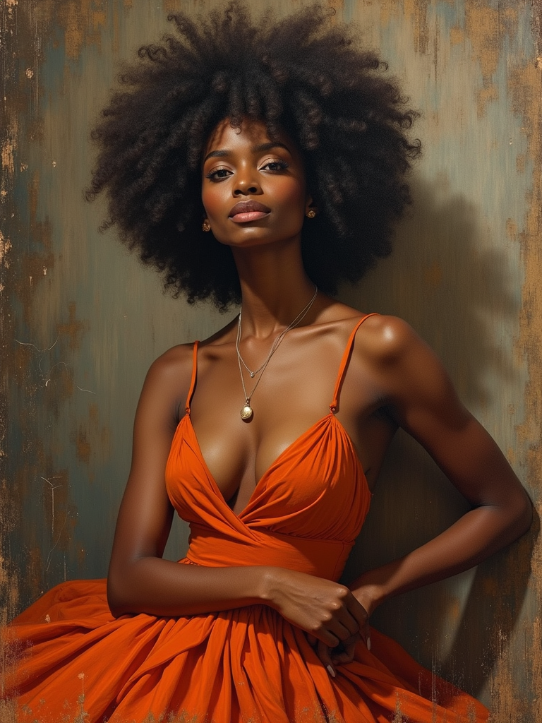Model transformed into an oil painting portrait. Elegant pose, flowing dress . Renaissance style, rich textures, artistic brushstrokes.