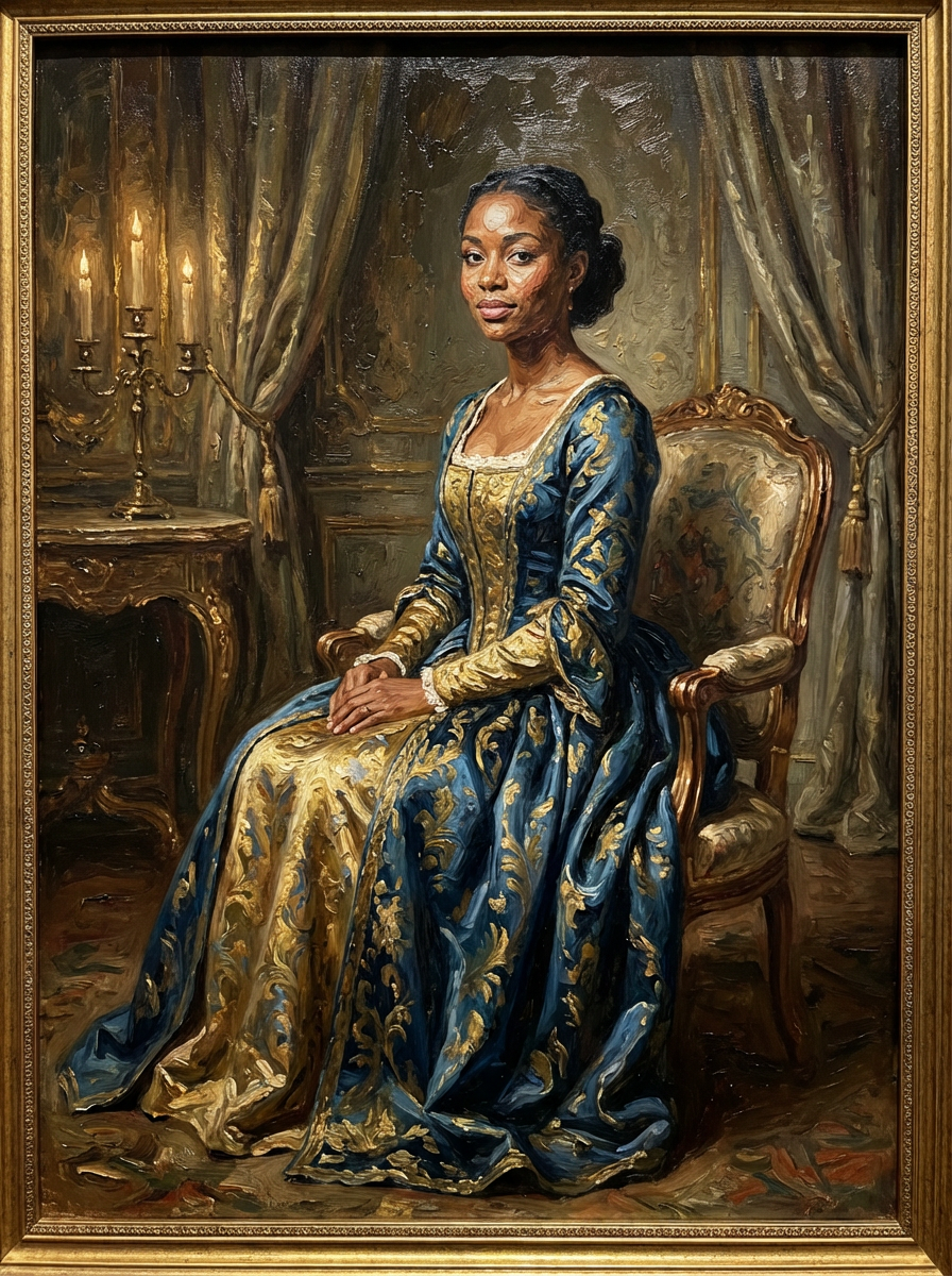 Model transformed into an oil painting portrait. Elegant pose, flowing dress . Renaissance style, rich textures, artistic brushstrokes.