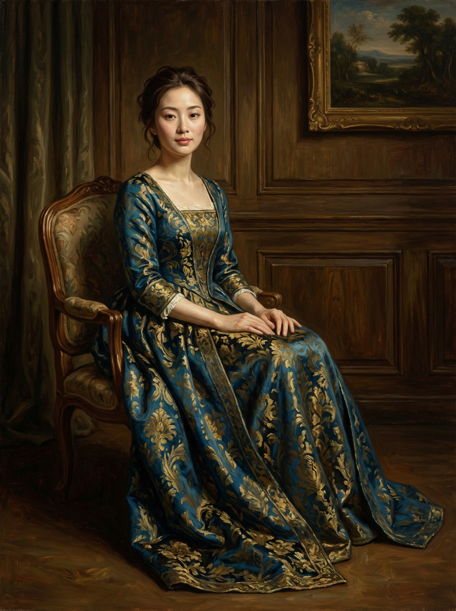 Model transformed into an oil painting portrait. Elegant pose, flowing dress . Renaissance style, rich textures, artistic brushstrokes.