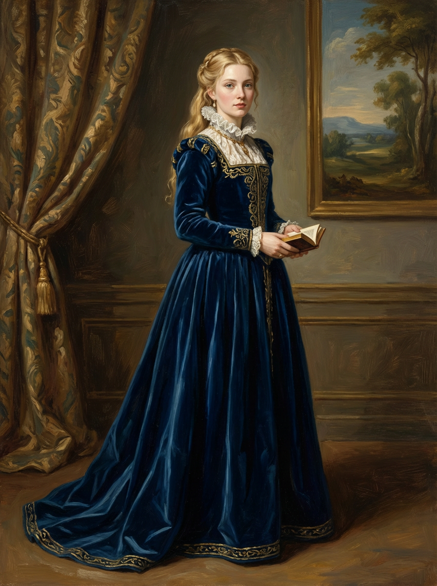 Model transformed into an oil painting portrait. Elegant pose, flowing dress . Renaissance style, rich textures, artistic brushstrokes.