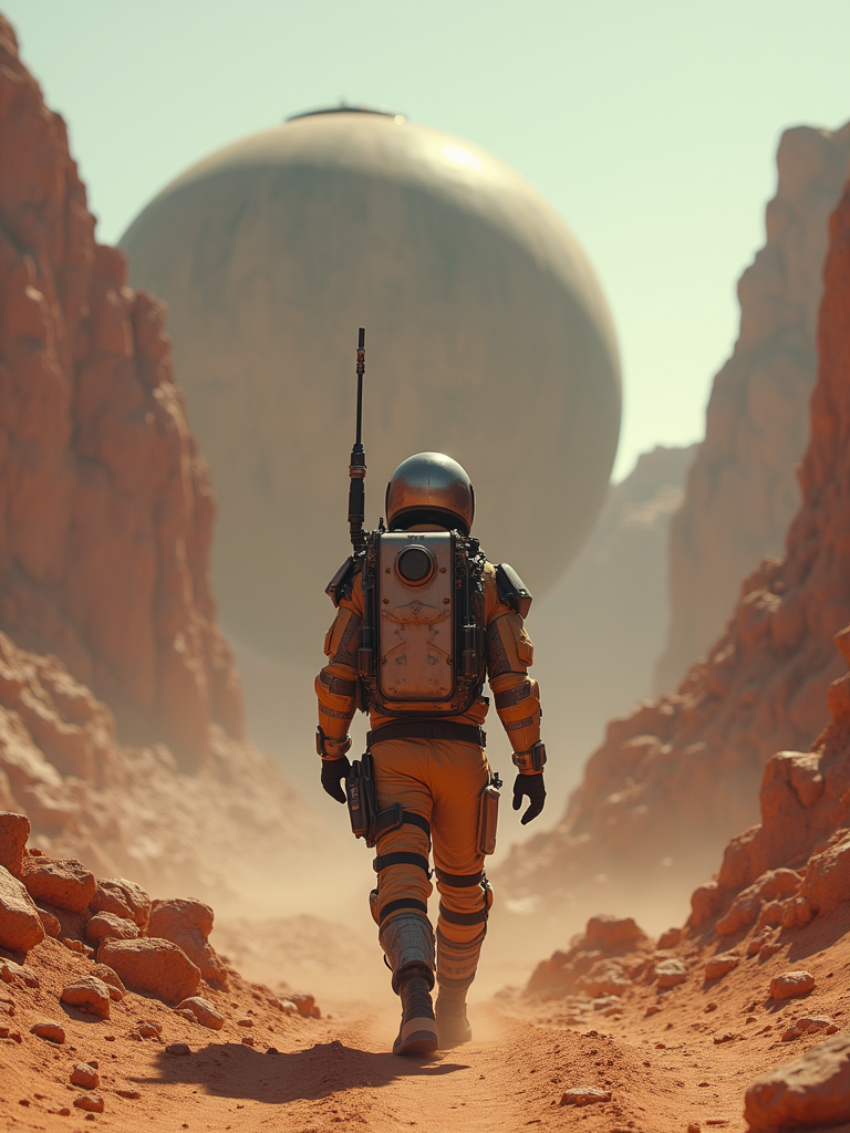 Model walking through a rocky alien desert toward a giant sphere structure. Wearing tactical armor with oxygen pack and helmet. Futuristic Mars-like terrain, cinematic sci-fi style.