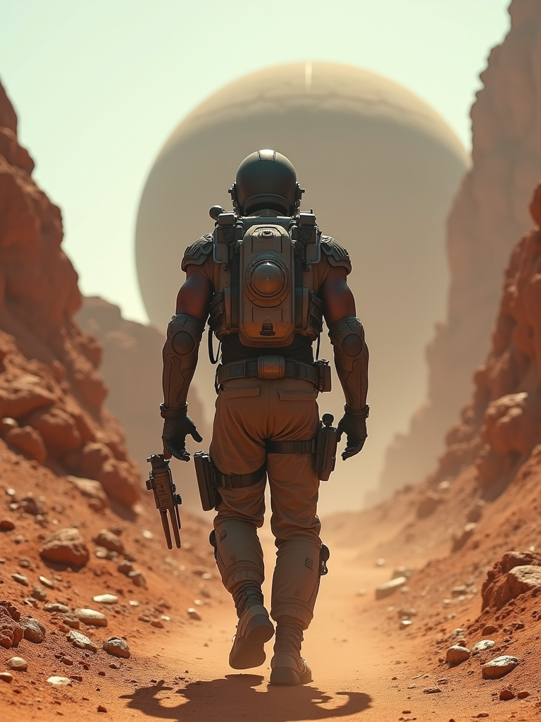 Model walking through a rocky alien desert toward a giant sphere structure. Wearing tactical armor with oxygen pack and helmet. Futuristic Mars-like terrain, cinematic sci-fi style.