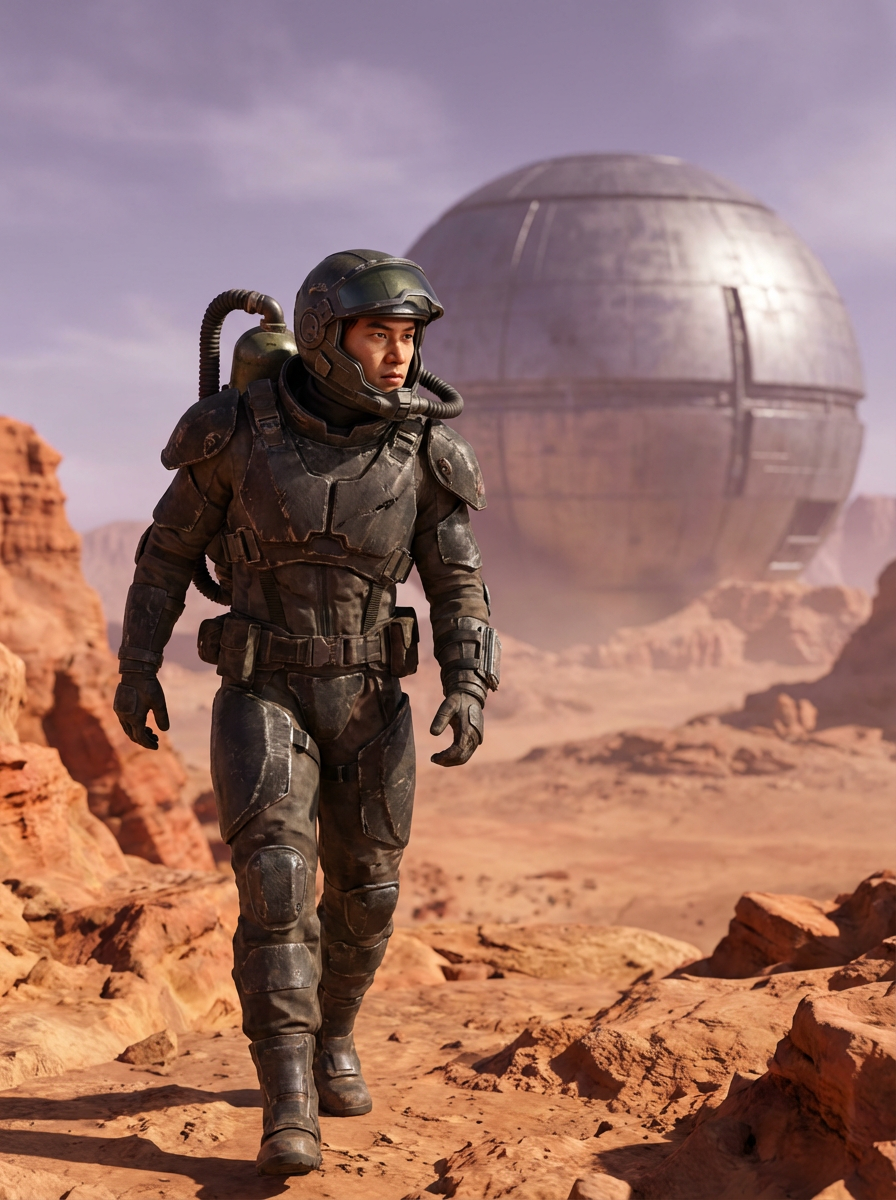 Model walking through a rocky alien desert toward a giant sphere structure. Wearing tactical armor with oxygen pack and helmet. Futuristic Mars-like terrain, cinematic sci-fi style.