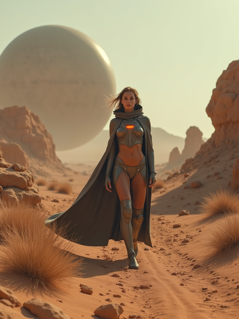 Model walking through a rocky alien desert toward a giant sphere structure. Wearing sci-fi cloak and bodysuit with glowing visor . Futuristic Mars-like terrain, cinematic sci-fi style.
