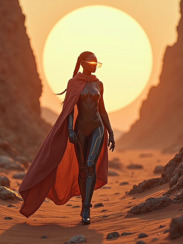 Model walking through a rocky alien desert toward a giant sphere structure. Wearing sci-fi cloak and bodysuit with glowing visor . Futuristic Mars-like terrain, cinematic sci-fi style.