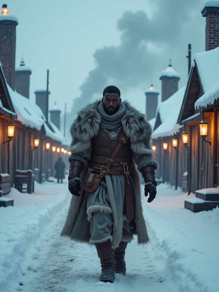 Model walking through a snowy outpost village with smoke rising from chimneys. Wearing heavy arctic armor with wolf pelts. Snowy environment, warm firelight, RPG town setting.