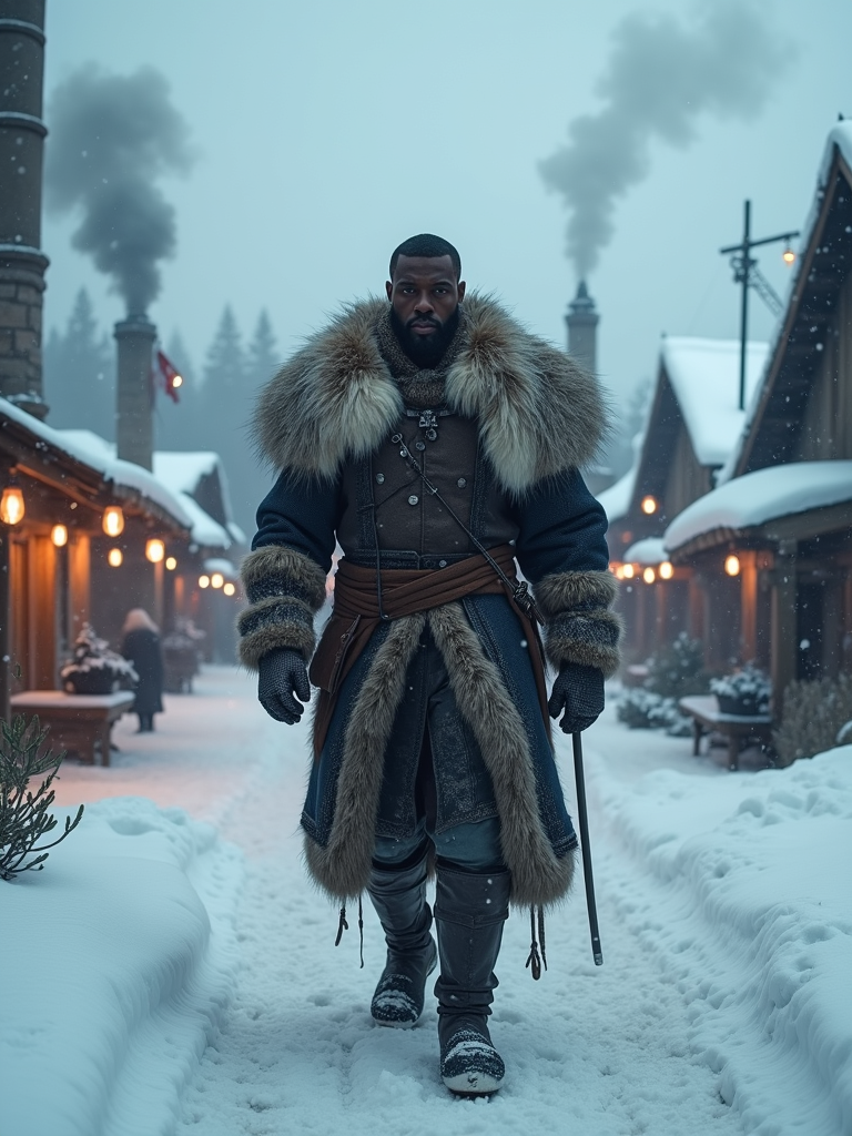 Model walking through a snowy outpost village with smoke rising from chimneys. Wearing heavy arctic armor with wolf pelts. Snowy environment, warm firelight, RPG town setting.