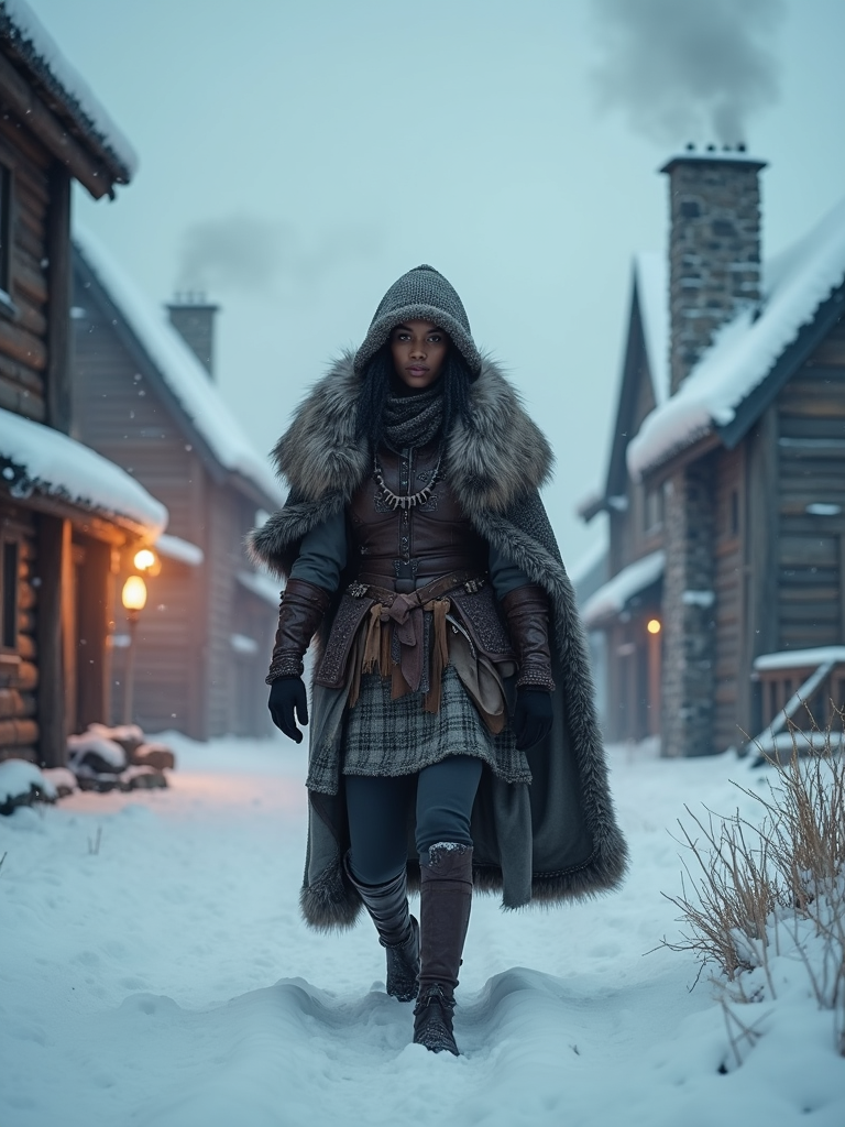 Model walking through a snowy outpost village with smoke rising from chimneys. Wearing a thick fur cloak, winter warrior outfit . Snowy environment, warm firelight, RPG town setting.