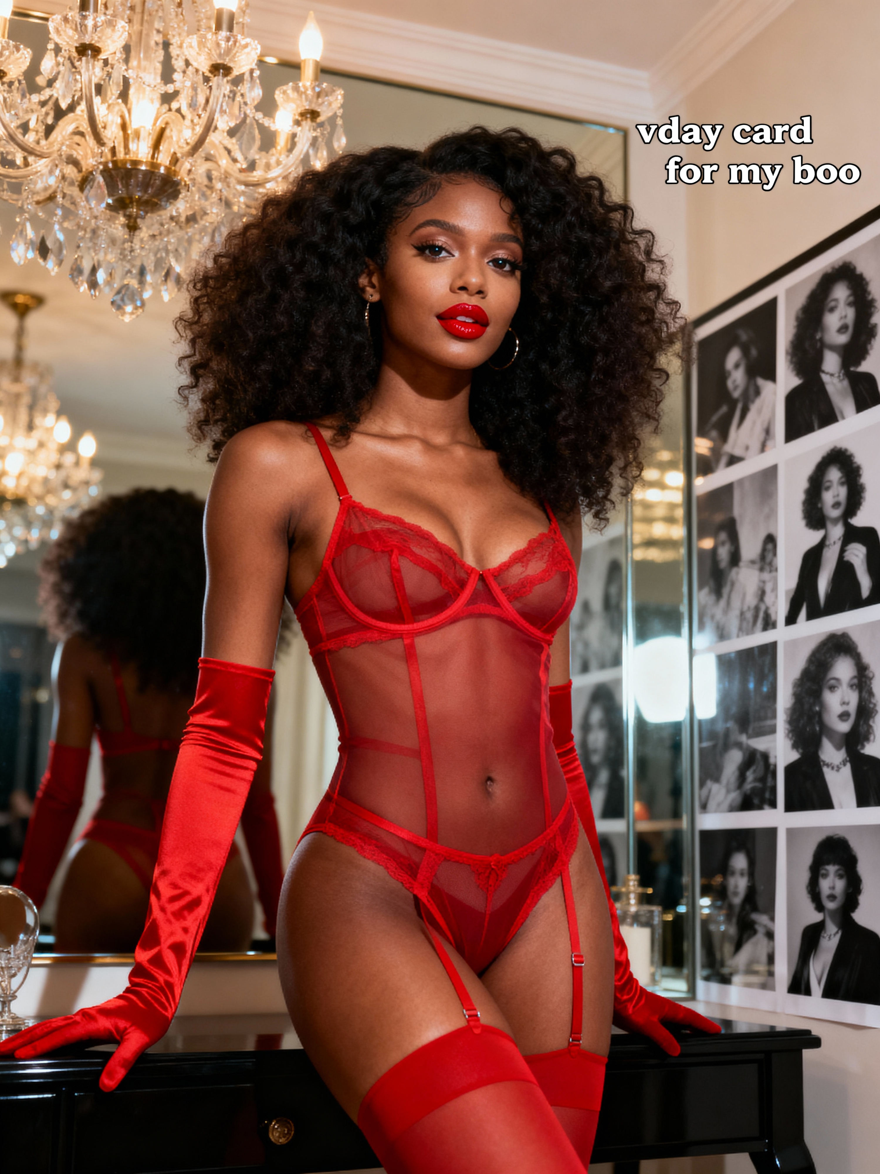 Model wearing a red sheer lingerie set with matching long red gloves and stockings. They have bold red lipstick and voluminous curly hair. The setting includes a large chandelier, mirrors, and a collage background with black and white images. Text reads "V-DAY CARD FOR MY BOO," adding a romantic theme.