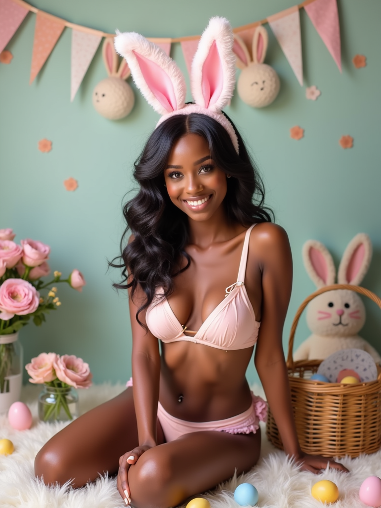 Model wearing a sexy bunny outfit, complete with bunny ears, a fluffy tail, and a pastel-colored lingerie set. She's posed in a playful Easter setting with painted eggs, spring flowers, and a basket of Easter treats. The backdrop features soft, pastel decorations with bunny-themed accents.