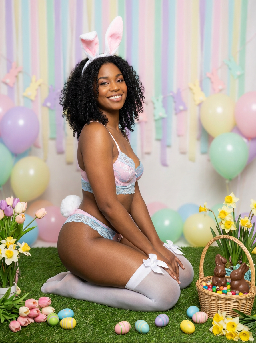 Model wearing a sexy bunny outfit, complete with bunny ears, a fluffy tail, and a pastel-colored lingerie set with thigh high stockings. She's posed in a playful Easter setting with painted eggs, spring flowers, and a basket of Easter treats. The backdrop features soft, pastel decorations with bunny-themed accents.