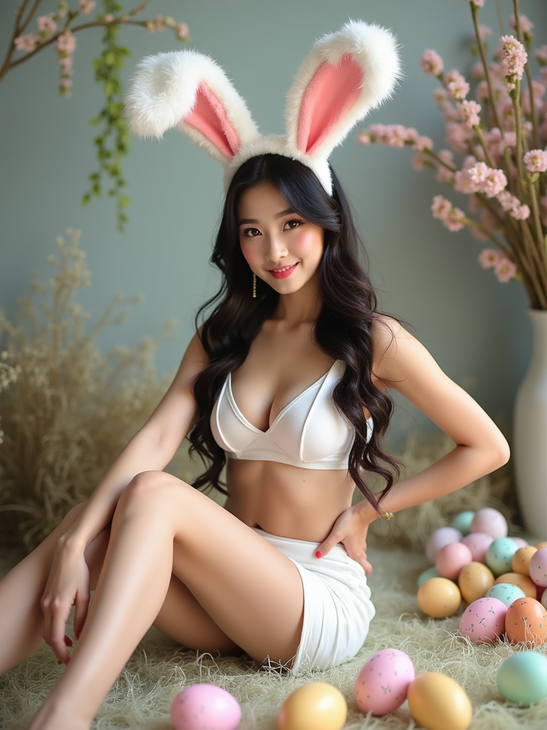 Model wearing (naughty bunny) (sexy Easter bunny costume) posing with Easter eggs and festive decorations, background includes a spring garden theme.