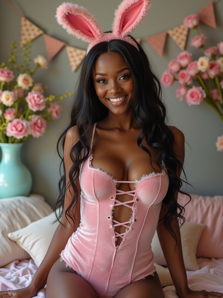 Model wearing (naughty bunny) (sexy Easter costume) (velvet bodysuit) (bunny ears) with a festive spring backdrop full of blooming flowers and Easter decorations.