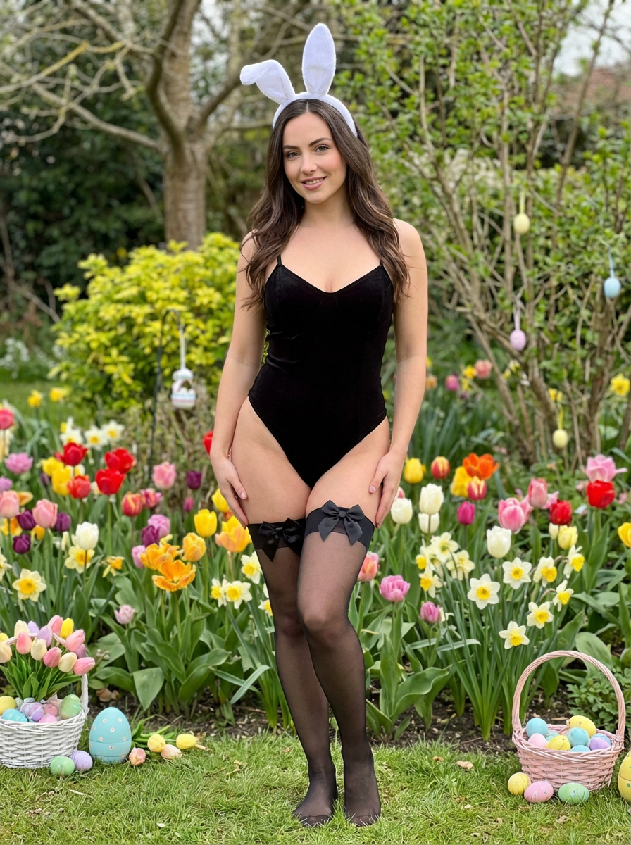 Model wearing (naughty bunny) (sexy Easter costume) (velvet bodysuit) with thigh high stockings and (bunny ears) with a festive spring backdrop full of blooming flowers and Easter decorations.