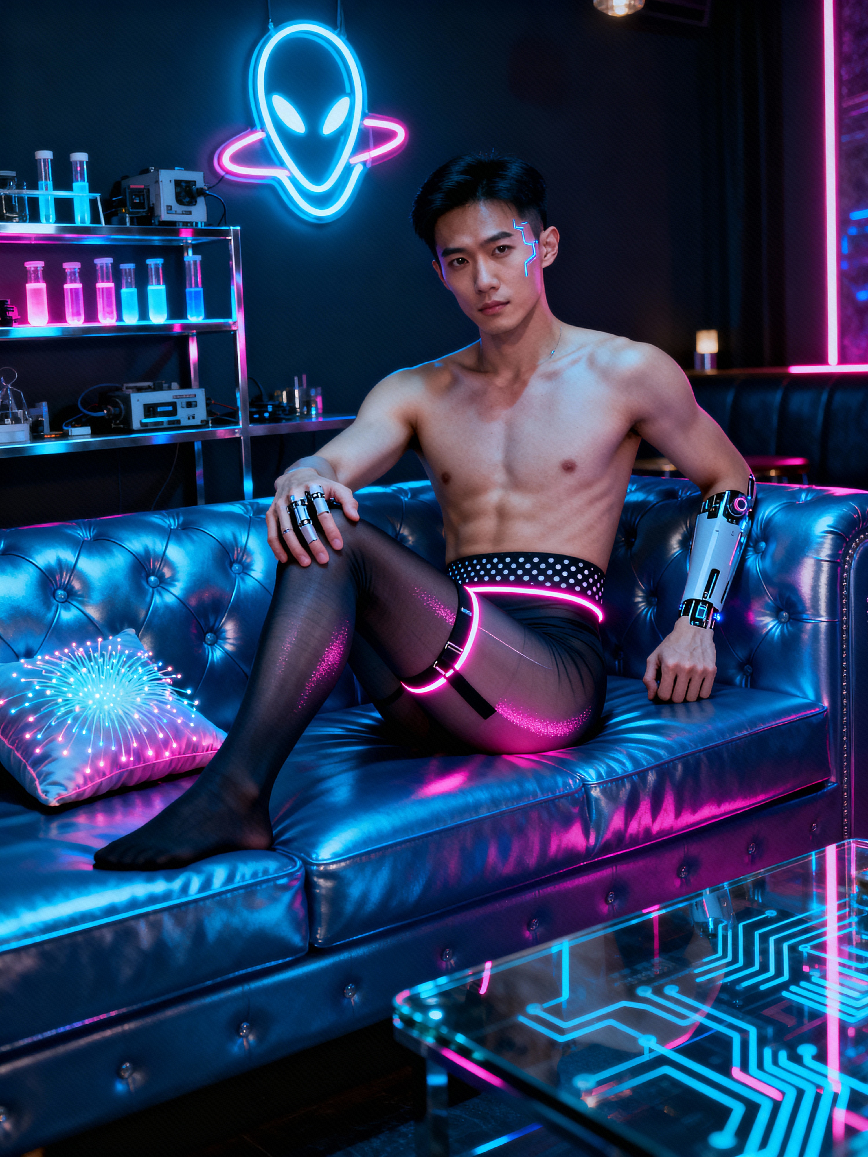 Model wearing sheer black nano-fabric tights with illuminated garter straps holding them up, focus on the upper thigh and hip area. The material displays a subtle polka-dot pattern on the waistband and a smooth, glowing texture down the leg. Harsh neon lighting in electric blue and magenta highlights the contours and reflective shimmer of the synthetic fabric. She is seated on a plush, metallic-blue, tufted sofa inside a dimly lit lounge filled with flickering holograms and augmented reality projections. Leaning against the back of the sofa, one cybernetic hand rests on her knee while the other grips the edge of the sofa. Behind her, a wall of chrome shelves displays glowing vials and tech relics, with a bright, cursive neon sign pulsing in an alien script. Two futuristic pillows with fiber-optic threads sit beside her, and a low reflective glass table with embedded circuitry is visible in the foreground.