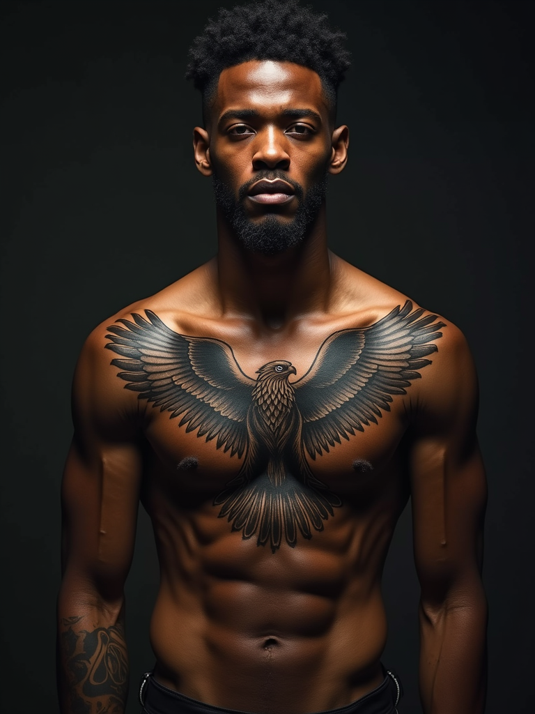 Model with a chest tattoo showcase. Large eagle chest tattoo, bold tribal ink. Deep shadows, powerful look.