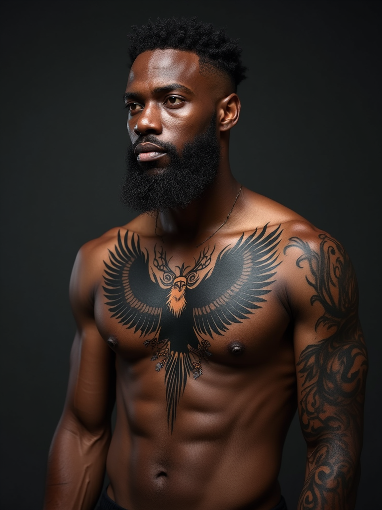 Model with a chest tattoo showcase. Large eagle chest tattoo, bold tribal ink. Deep shadows, powerful look.