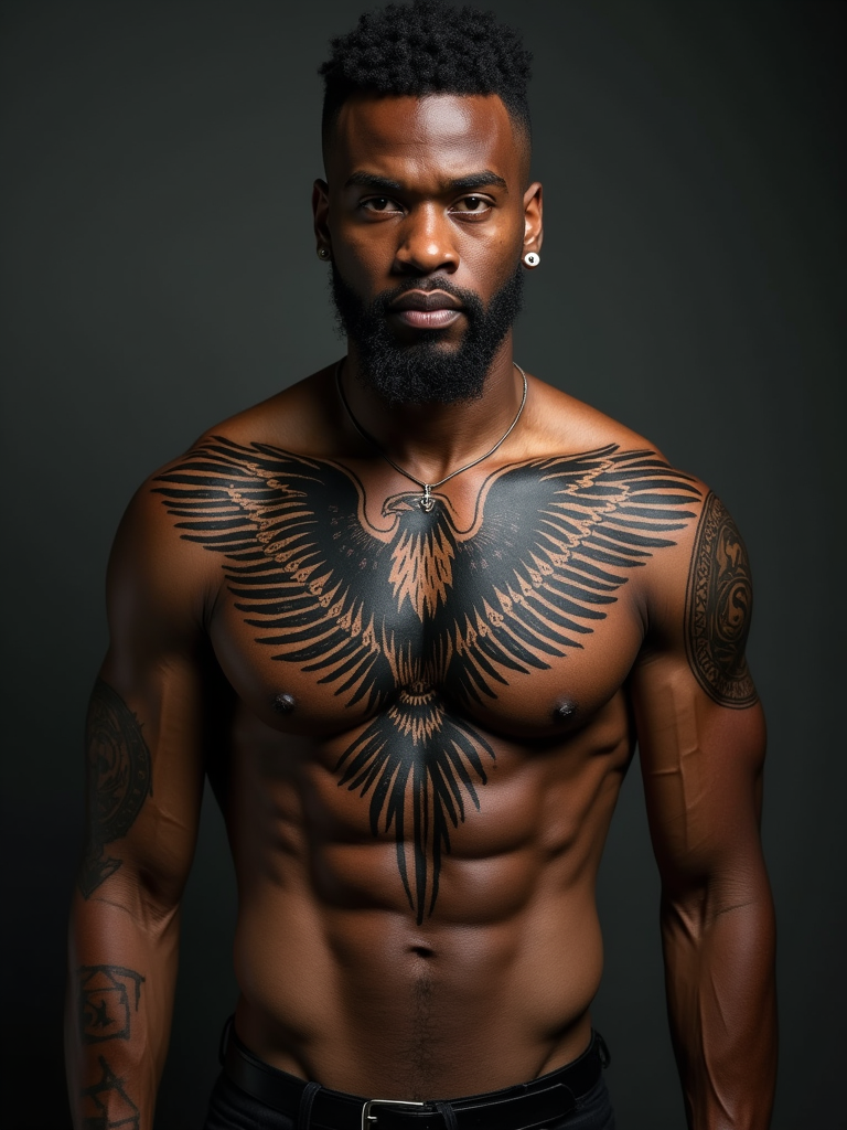 Model with a chest tattoo showcase. Large eagle chest tattoo, bold tribal ink. Deep shadows, powerful look.