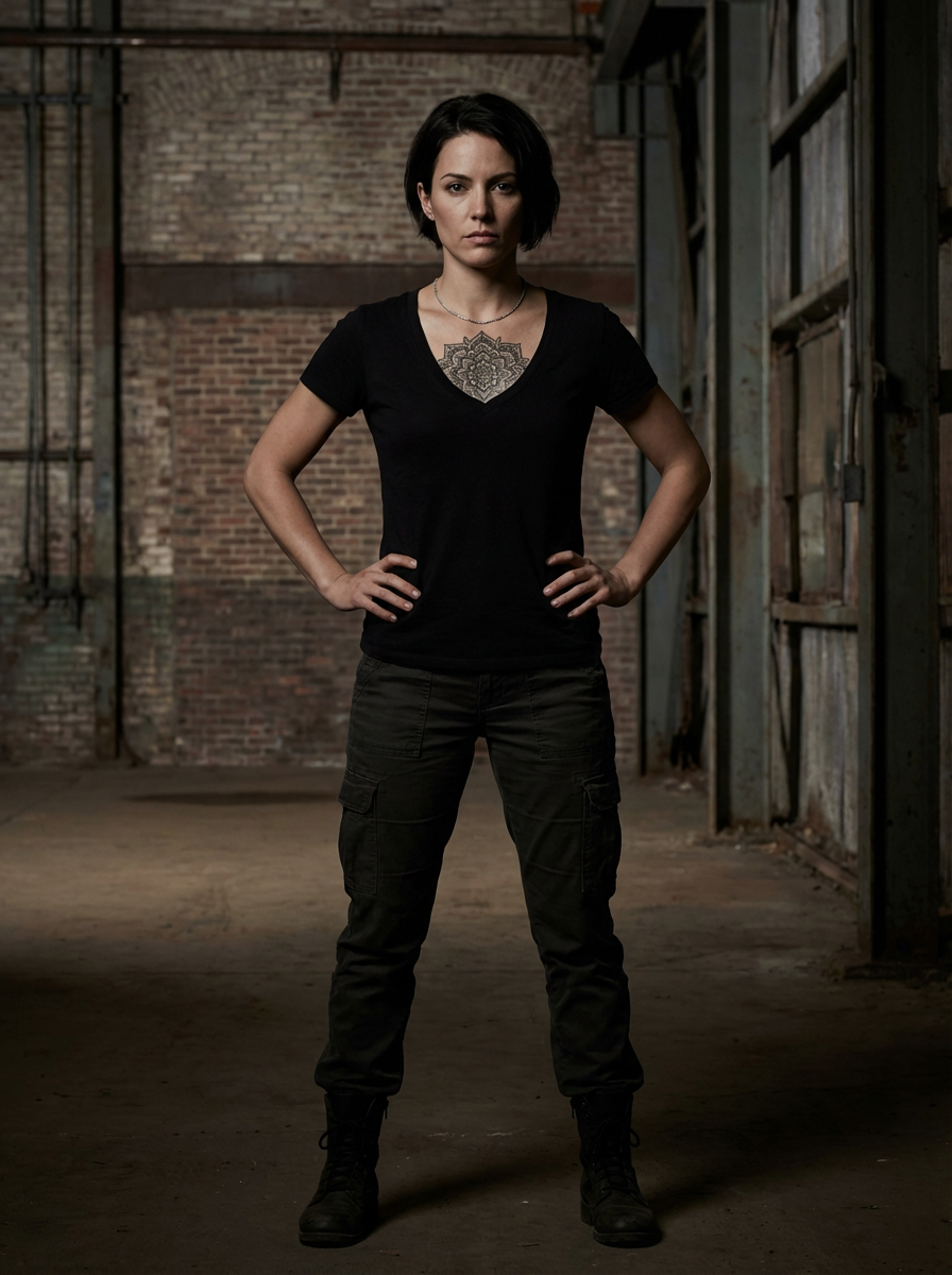 Model with a chest tattoo showcase. Mandala-style chest tattoo, elegant symmetry . Deep shadows, powerful look.