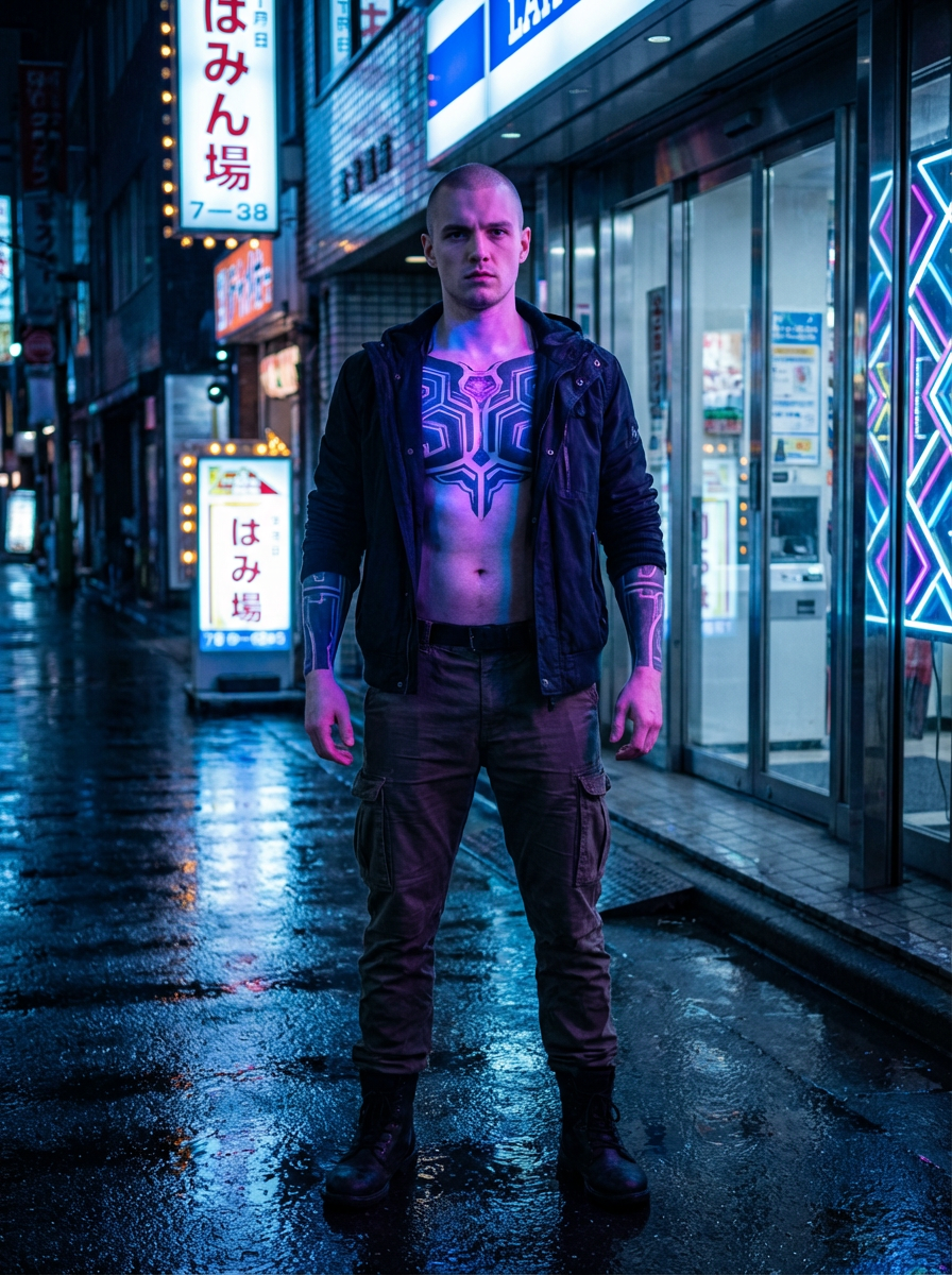 Model with a cyberpunk tattoo designs glowing under neon lights. Bold symmetrical cyberpunk tattoo. Tokyo night aesthetic.