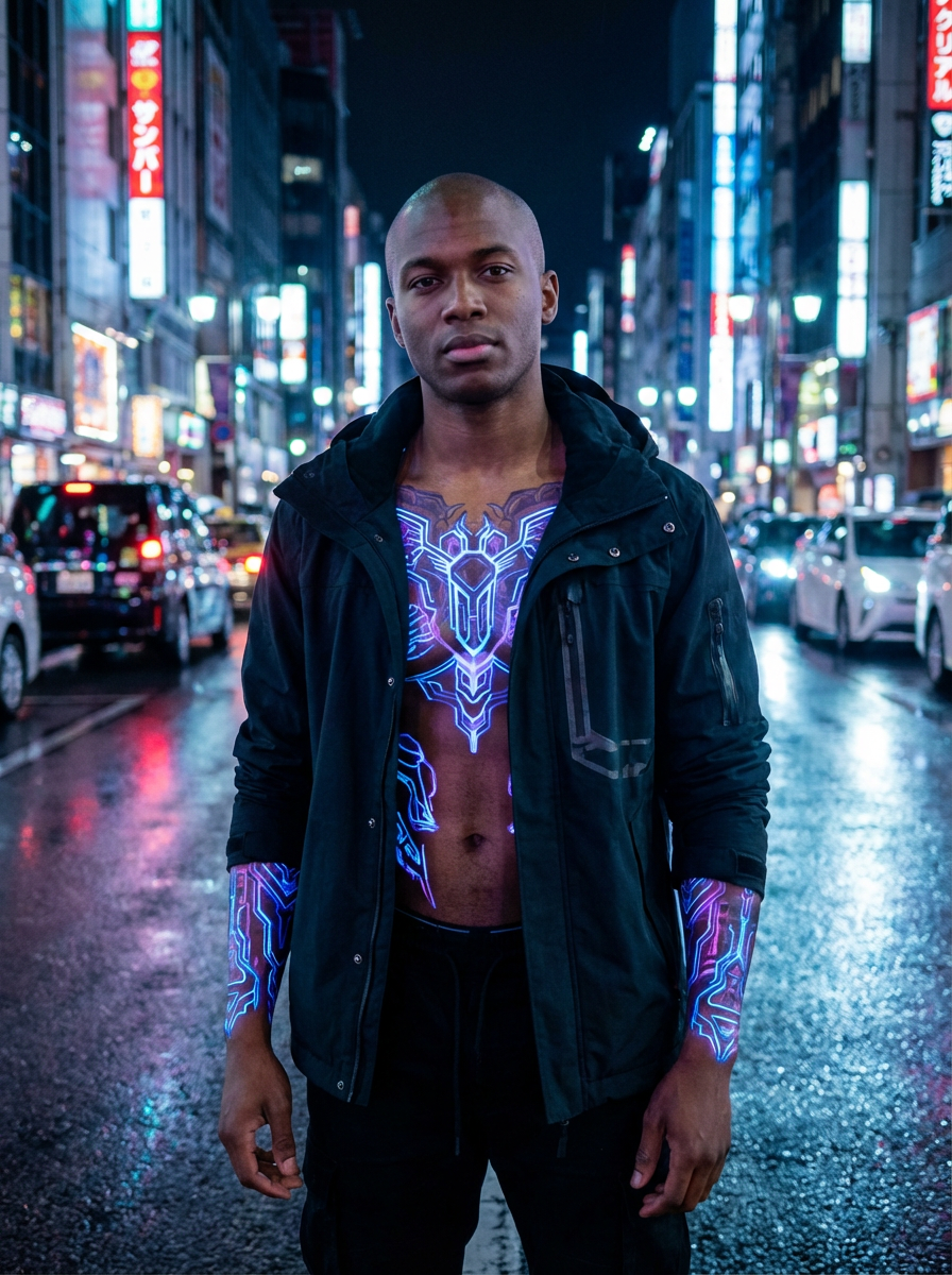 Model with a cyberpunk tattoo designs glowing under neon lights. Bold symmetrical cyberpunk tattoo. Tokyo night aesthetic.