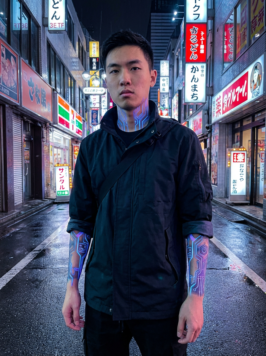 Model with a cyberpunk tattoo designs glowing under neon lights. Bold symmetrical cyberpunk tattoo. Tokyo night aesthetic.