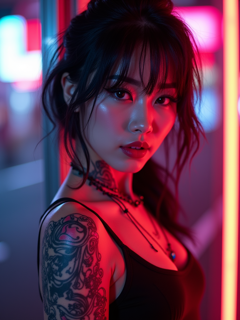 Model with a cyberpunk tattoo designs glowing under neon lights. Futuristic circuit-style tattoo . Tokyo night aesthetic.