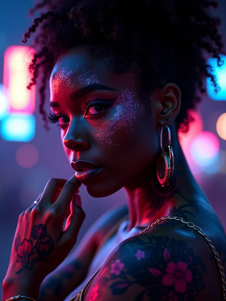 Model with a cyberpunk tattoo designs glowing under neon lights. Futuristic circuit-style tattoo . Tokyo night aesthetic.
