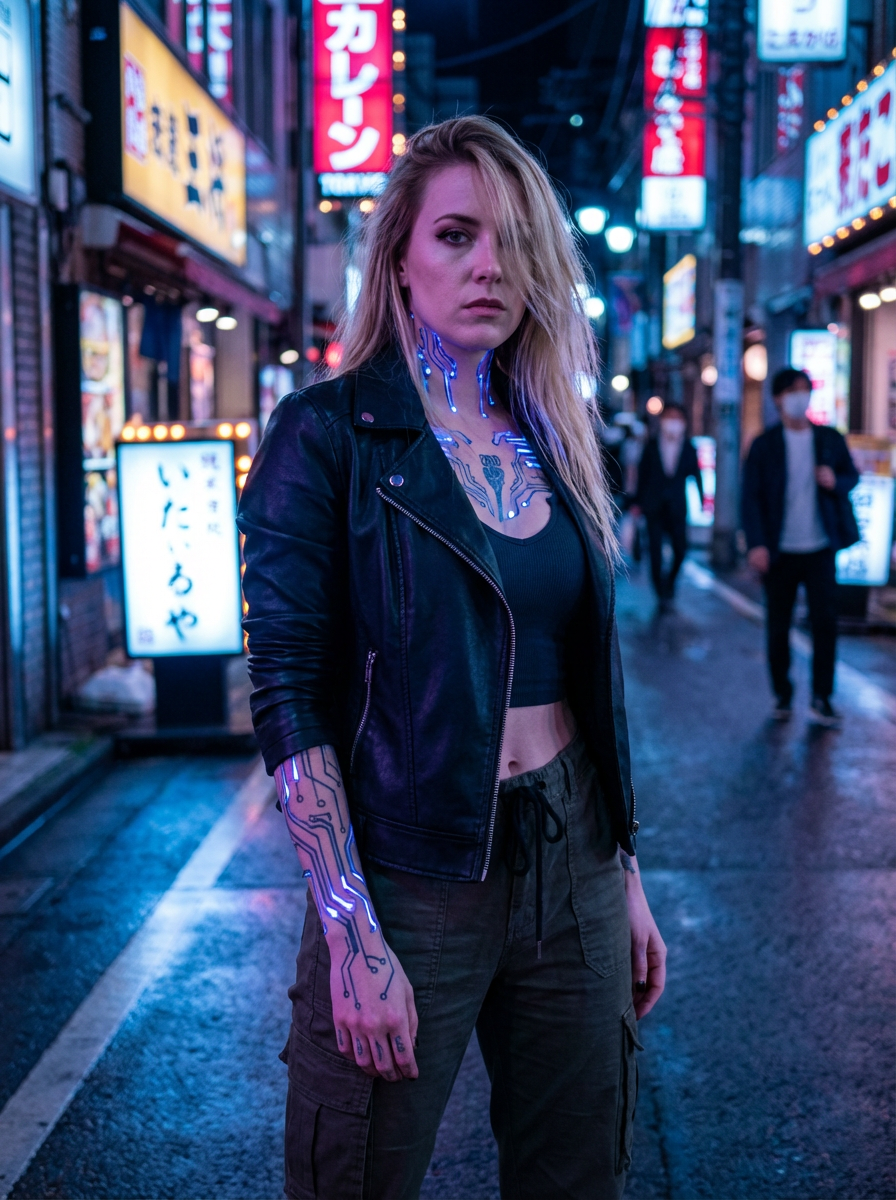 Model with a cyberpunk tattoo designs glowing under neon lights. Futuristic circuit-style tattoo . Tokyo night aesthetic.