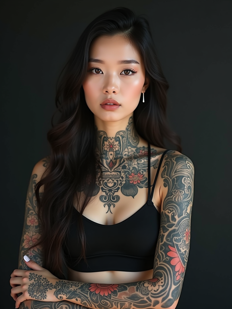 Model with a full sleeve tattoo, intricate tattoo. Wearing a cropped top, showing off arm tattoos . Detailed tattoo art, high contrast photography.