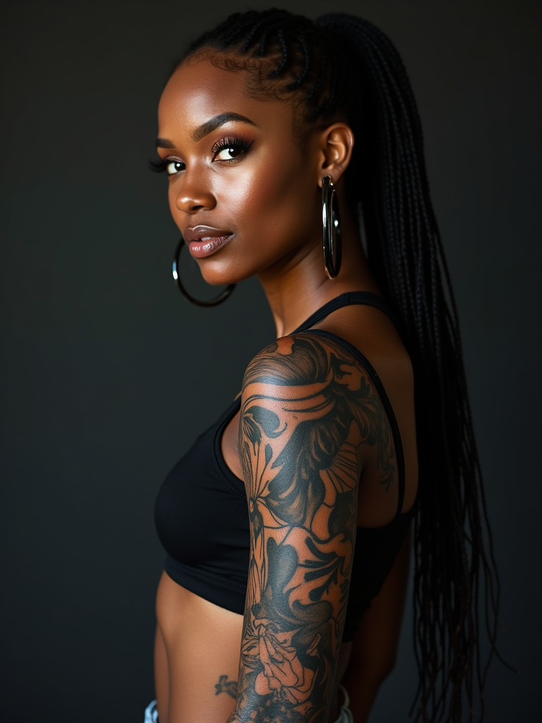 Model with a full sleeve tattoo, intricate tattoo. Wearing a cropped top, showing off arm tattoos . Detailed tattoo art, high contrast photography.