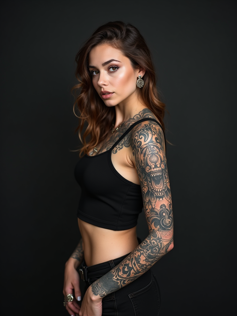 Model with a full sleeve tattoo, intricate tattoo. Wearing a cropped top, showing off arm tattoos . Detailed tattoo art, high contrast photography.