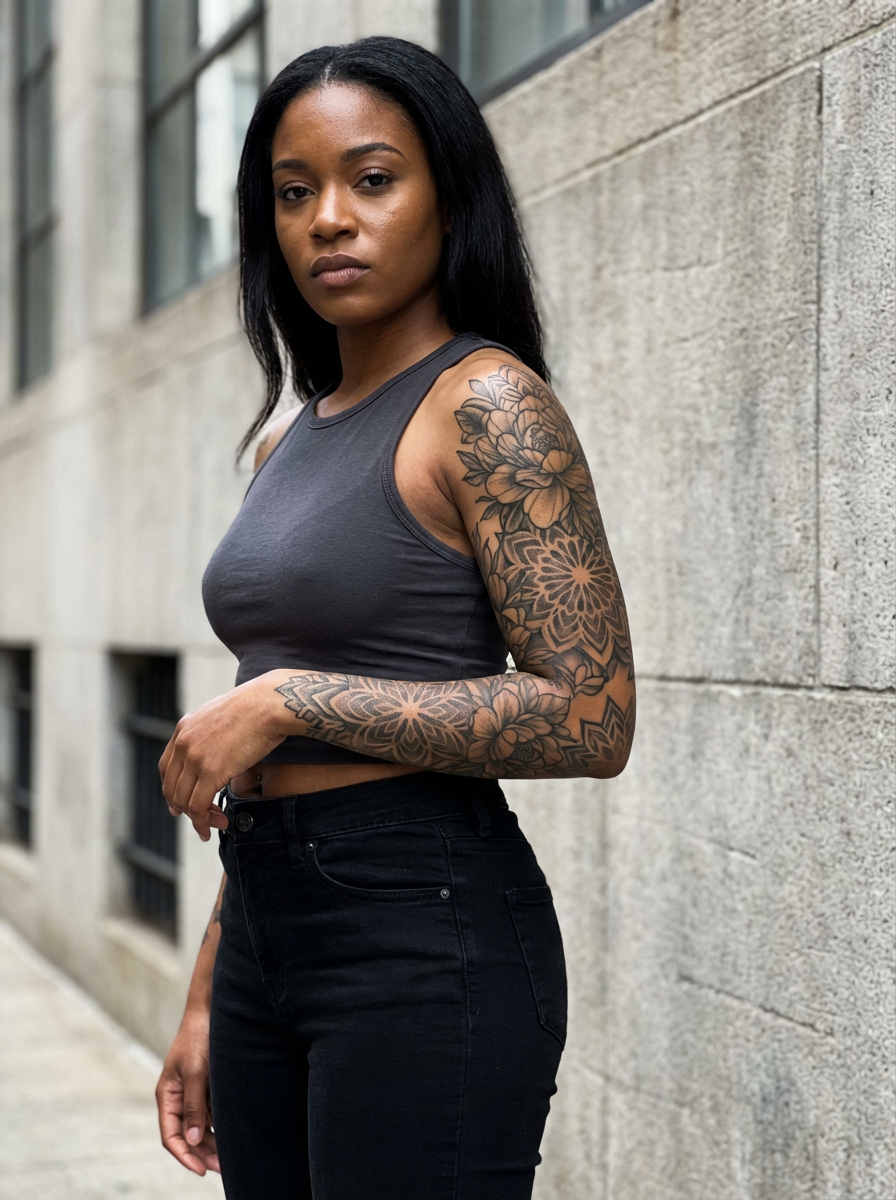 Model with a full sleeve tattoo, intricate tattoo. Wearing a cropped top, showing off arm tattoos . Detailed tattoo art, high contrast photography.