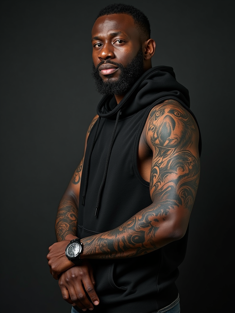 Model with a full sleeve tattoo, intricate tattoo. Wearing a sleeveless hoodie, tattoos visible. Detailed tattoo art, high contrast photography.