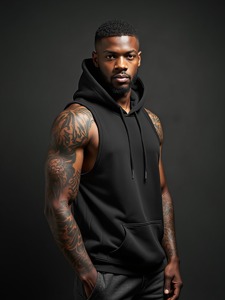 Model with a full sleeve tattoo, intricate tattoo. Wearing a sleeveless hoodie, tattoos visible. Detailed tattoo art, high contrast photography.