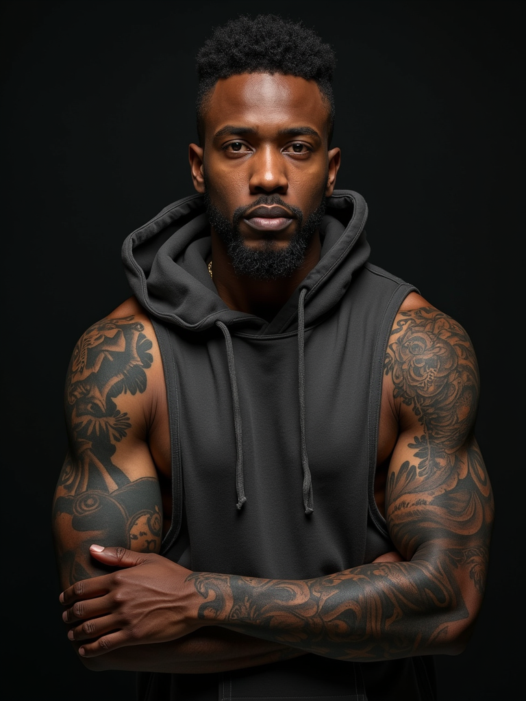 Model with a full sleeve tattoo, intricate tattoo. Wearing a sleeveless hoodie, tattoos visible. Detailed tattoo art, high contrast photography.