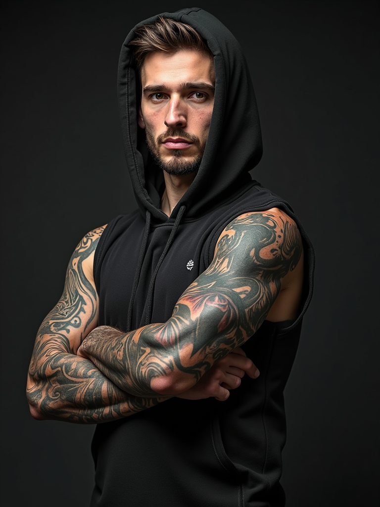 Model with a full sleeve tattoo, intricate tattoo. Wearing a sleeveless hoodie, tattoos visible. Detailed tattoo art, high contrast photography.
