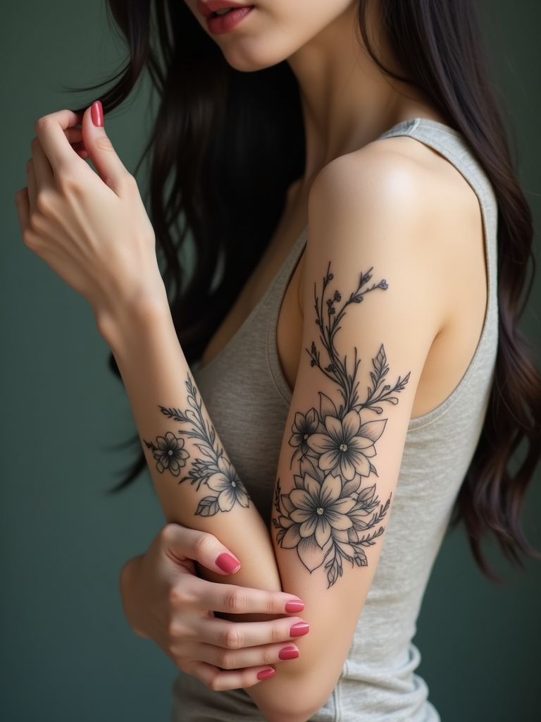Model with a minimalist fine-line tattoos on the arm and wrist. Elegant floral design wrapping around the forearm . Subtle and stylish body art.