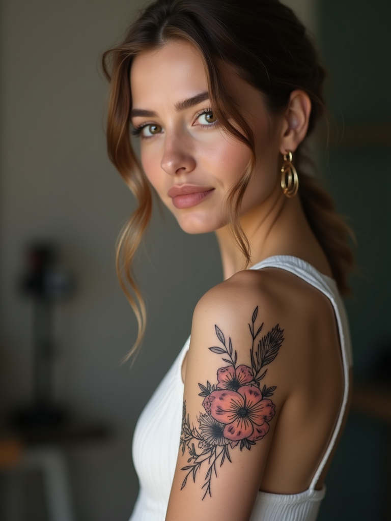 Model with a minimalist fine-line tattoos on the arm and wrist. Elegant floral design wrapping around the forearm . Subtle and stylish body art.